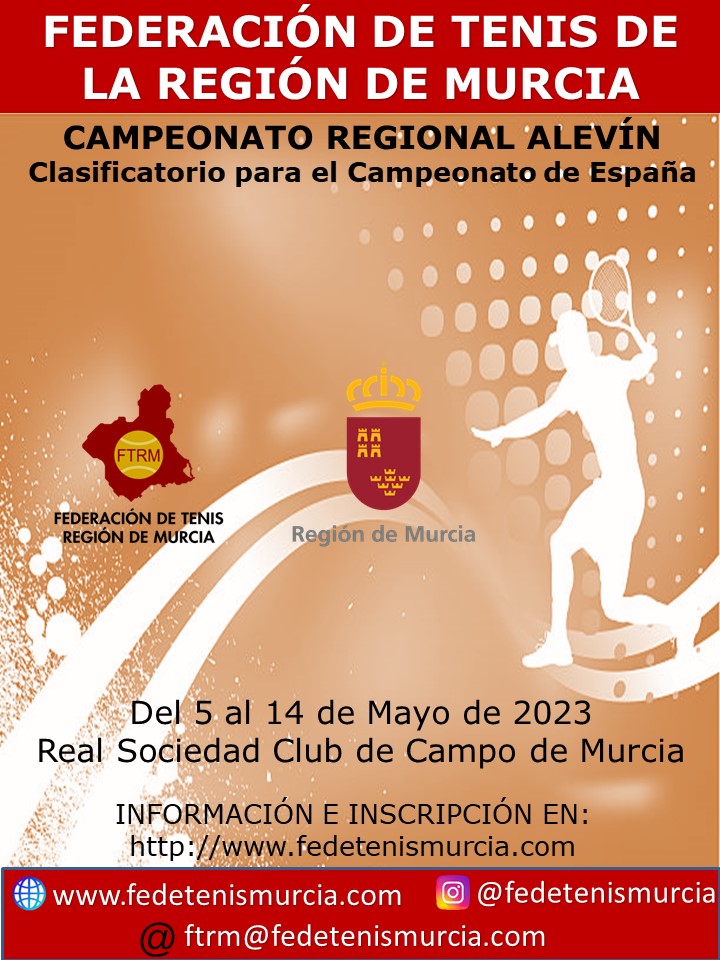 El Campeonato Regional Alevín, se celebrará en la Real Sociedad Club de Campo de Murcia del 5 al 14 de Mayo de 2023. El límite de inscripción será el jueves 27 de abril a las 14 horas de 2023. El Campeonato de España Alevín, se celebrará en la Emilio Sánchez Academy (Barcelona) a partir del 18 de Junio.