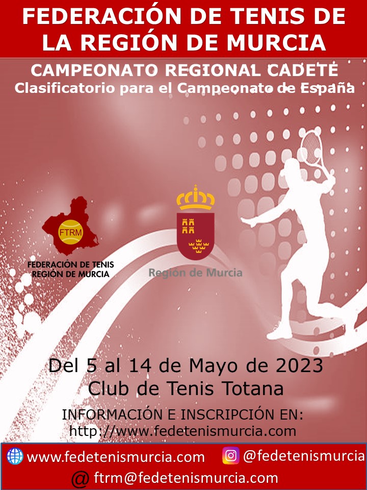 El Campeonato Regional Cadete, se celebrará en el Club de Tenis Totana del 5 al 14 de Mayo de 2023. El límite de inscripción será el jueves 27 de abril a las 14 horas de 2023. El Campeonato de España Cadete, se celebrará en el Club Tennis Vic, (Vic) a partir del 19 de Junio.