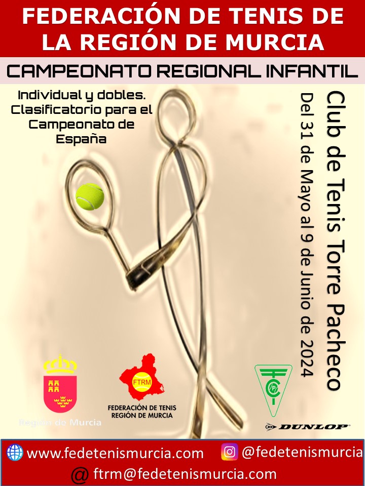 El Campeonato Regional Infantil se disputará del 31 de mayo al 9 de junio de 2024 en el Club de Tenis Torre Pacheco. El Campeonato es clasificatorio para el Campeonato de España y se clasificarán los tres primeros jugadores y jugadoras en la modalidad individual y la pareja campeona en dobles masculina y femenina.