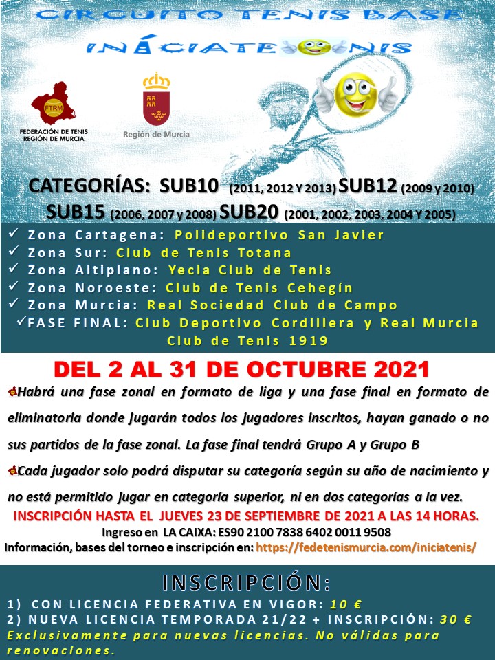 La Federación de Tenis de la Región de Murcia, pone en marcha la segunda prueba del Iniciatenis. Del 2 al 31 de Octubre, se jugará en distintas sedes de los clubes de la Región de Murcia esta fase del iniciatenis dirigida al tenis base e intermedio de los clubes.