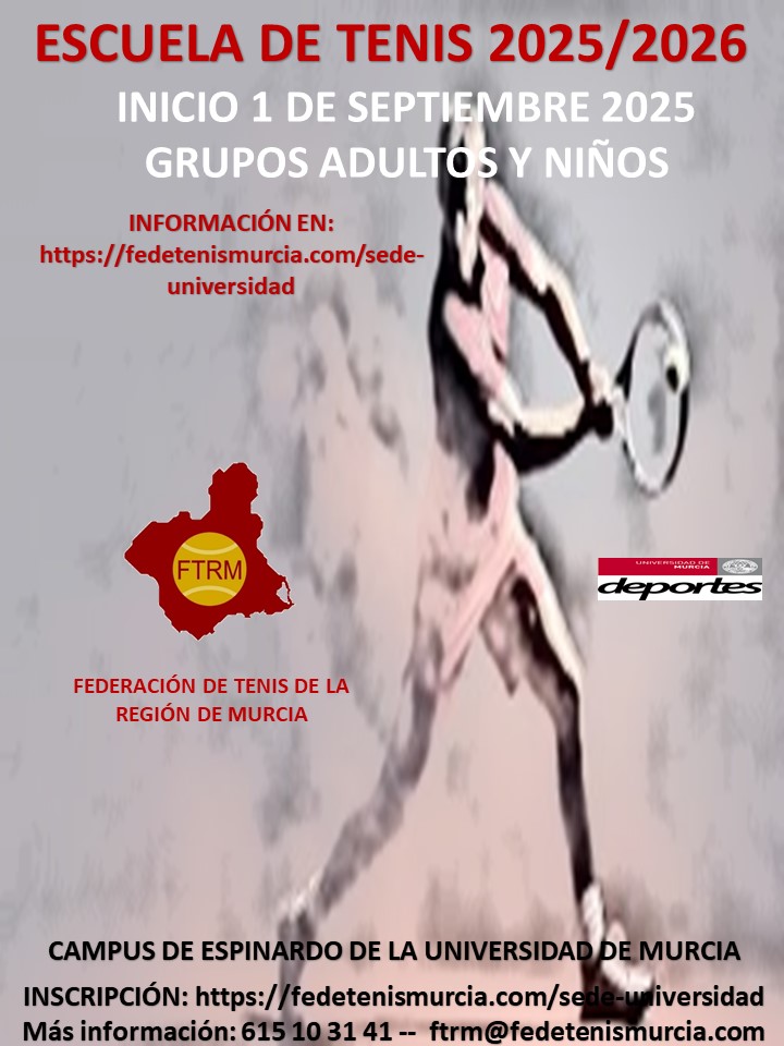 La Federación de Tenis de la Región de Murcia, abre el plazo de inscripción para su Escuela de Tenis en la sede del Campus de Espinardo de la Universidad de Murcia.