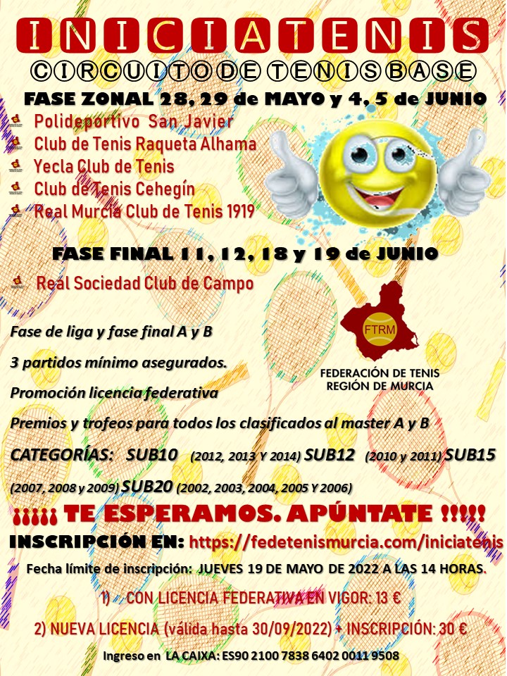 A partir del 28 de Mayo, vuelve una nueva edición del iniciatenis. Se disputará del 28 de mayo al 12 junio. La fase de liguilla se jugará en los siguientes clubes: