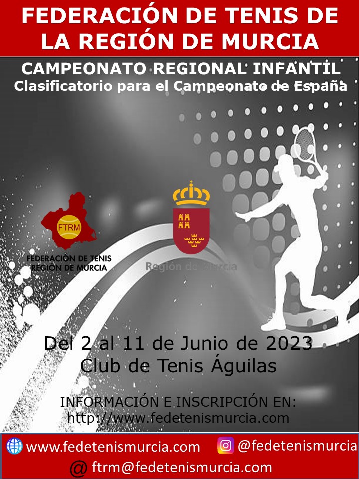 El Campeonato Regional Infantil, se celebrará en el Club de Tenis Águilas del 2 al 11 de Junio de 2023. El límite de inscripción será el jueves 25 de mayo a las 16  horas de 2023. El Campeonato de España Infantil, se celebrará en el AD Stadium Casablanca de Zaragoza a partir del 9 de Julio.