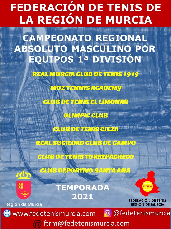 El próximo fin de semana 27-28 de Noviembre, se disputará la final del Campeonato Regional por Equipo Absoluto Masculino de 1ª División. El Real Murcia Club de Tenis y el Club de Tenis El Limonar disputarán dicha final. El Real Murcia Club de Tenis, se ha impuesto al Club Deportivo Santa Ana y al Olimpic Club para llegar a la final. Por su parte, el Club de Tenis el Limonar, se impuso al Club de Tenis Torrepacheco y a MDZ Tennis Academy.