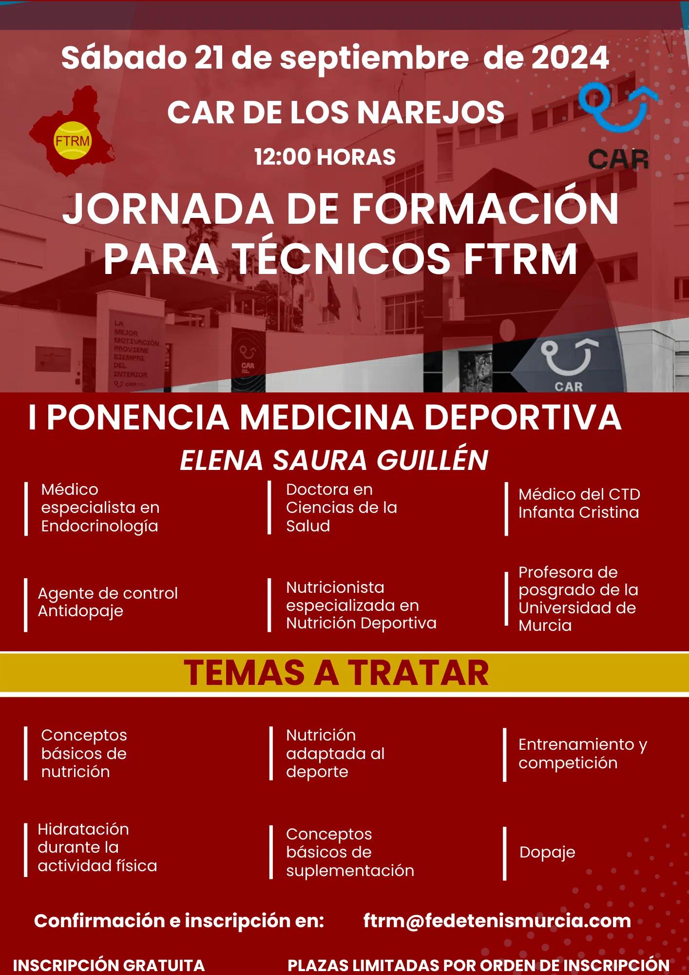 La Federación de Tenis de la Región de Murcia va a celebrar el próximo sábado 21 de septiembre de 2024 en las instalaciones del CAR de Los Narejos la I Ponencia de Medicina Deportiva.