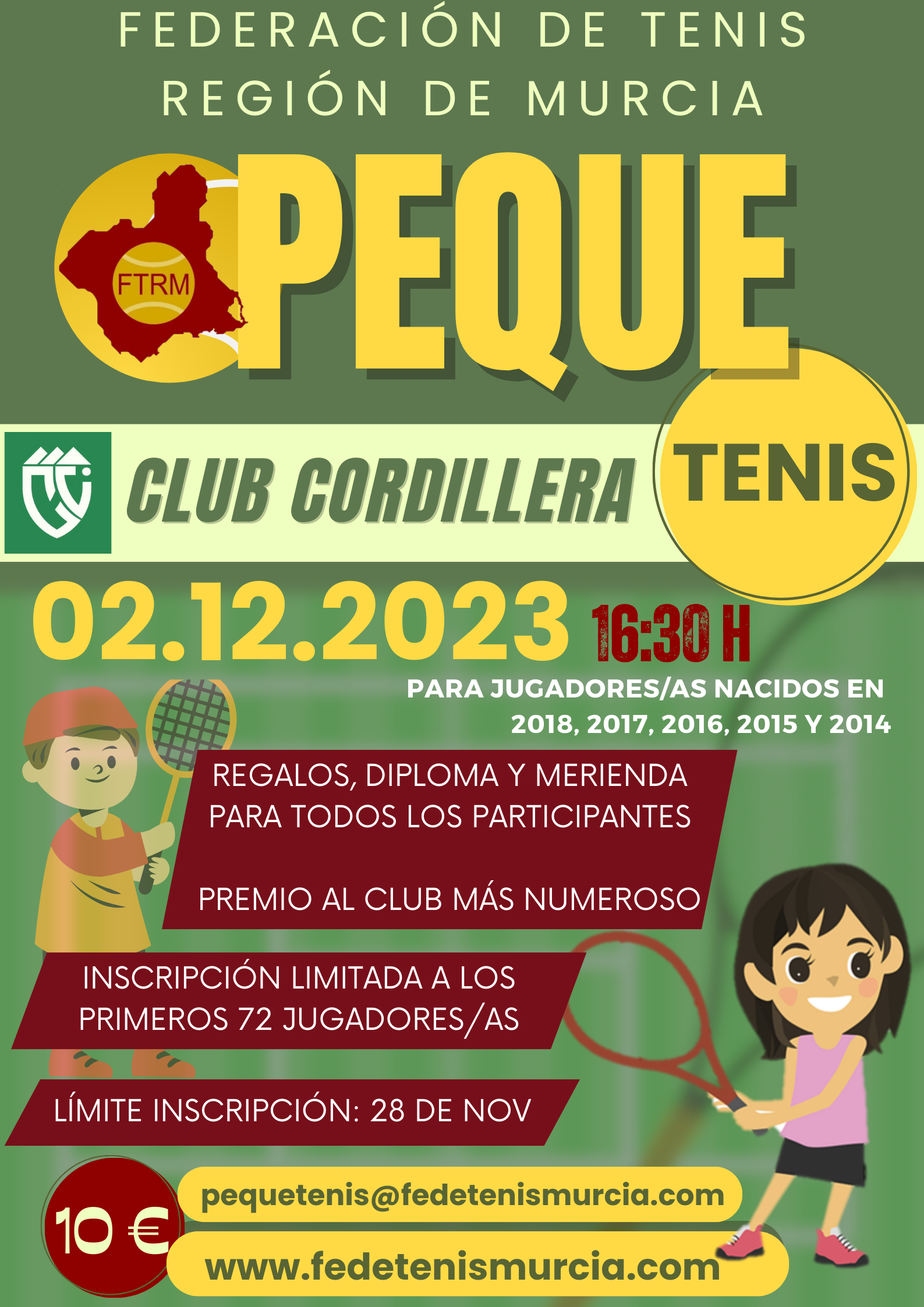 La Federación de Tenis de la Región de Murcia, va a realizar una nueva prueba del PEQUETENIS. En esta ocasión, será en las instalaciones del Club Deportivo Cordillera el sábado 2 de diciembre. El plazo límite de inscripción será el 28 de noviembre y las plazas son limitadas.