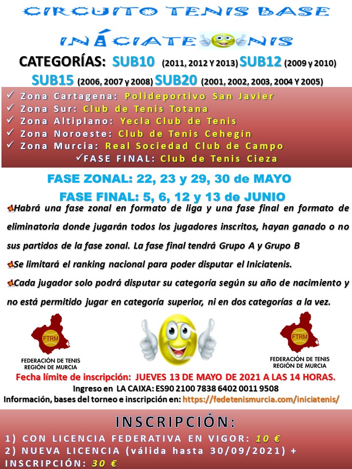 A partir del 22 de Mayo vuelve el torneo base de la Federación de Tenis de la Región de Murcia. El Iniciatenis se disputará en cinco zonas en una primera fase que se jugará en forma de liguilla. La fase final se disputará en el Club de Tenis Nuevo Nivel Los Alcázares.