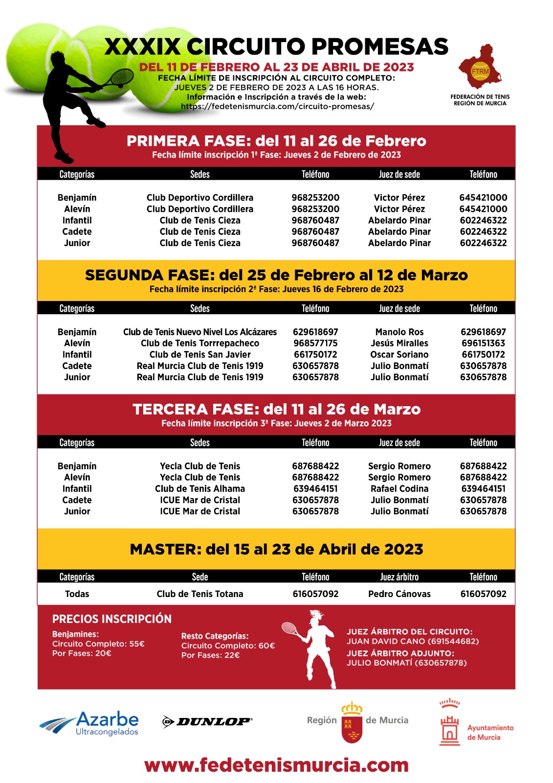 El Circuito consta de tres fases y un master final repartidos en distintas sedes de los clubes de tenis de la Región de Murcia. El Juez Árbitro del Circuito será Juan David Cano y el Juez Árbitro Adjunto será Julio Bonmatí.